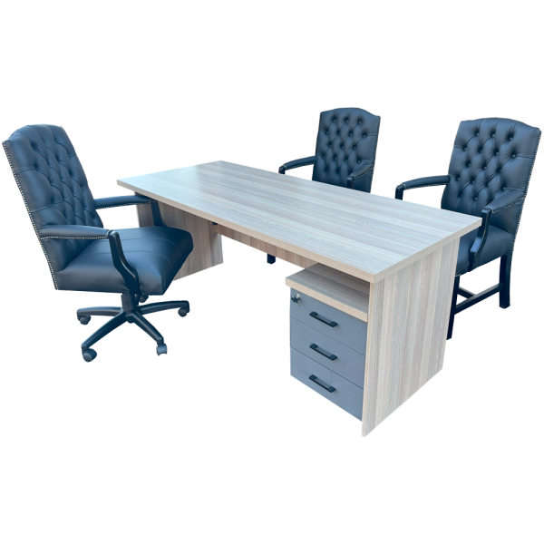 This 5 Piece Office Set Special Aged Oak includes an IQ desk 1800, an Empire executive black genuine leather button chair, 2 Empire black genuine leather arm chairs and Mobile pedestal providing a complete and stylish solution for any office or workspace.