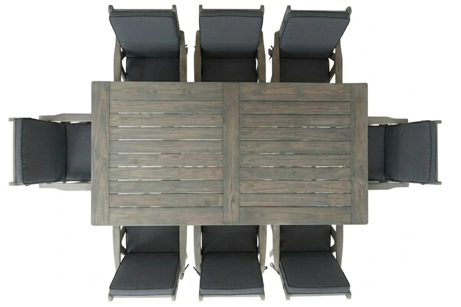 Aged Oak Patio Dining Set 8-Seater 2400mm | x1 Table + x8 Highback Chairs + Charcoal Seat & Back Cushions is characterized by its rustic charm and sturdy construction which makes it a must-have piece of quality furniture at a low price. Use under and cover with a cover bag if not under roof cover