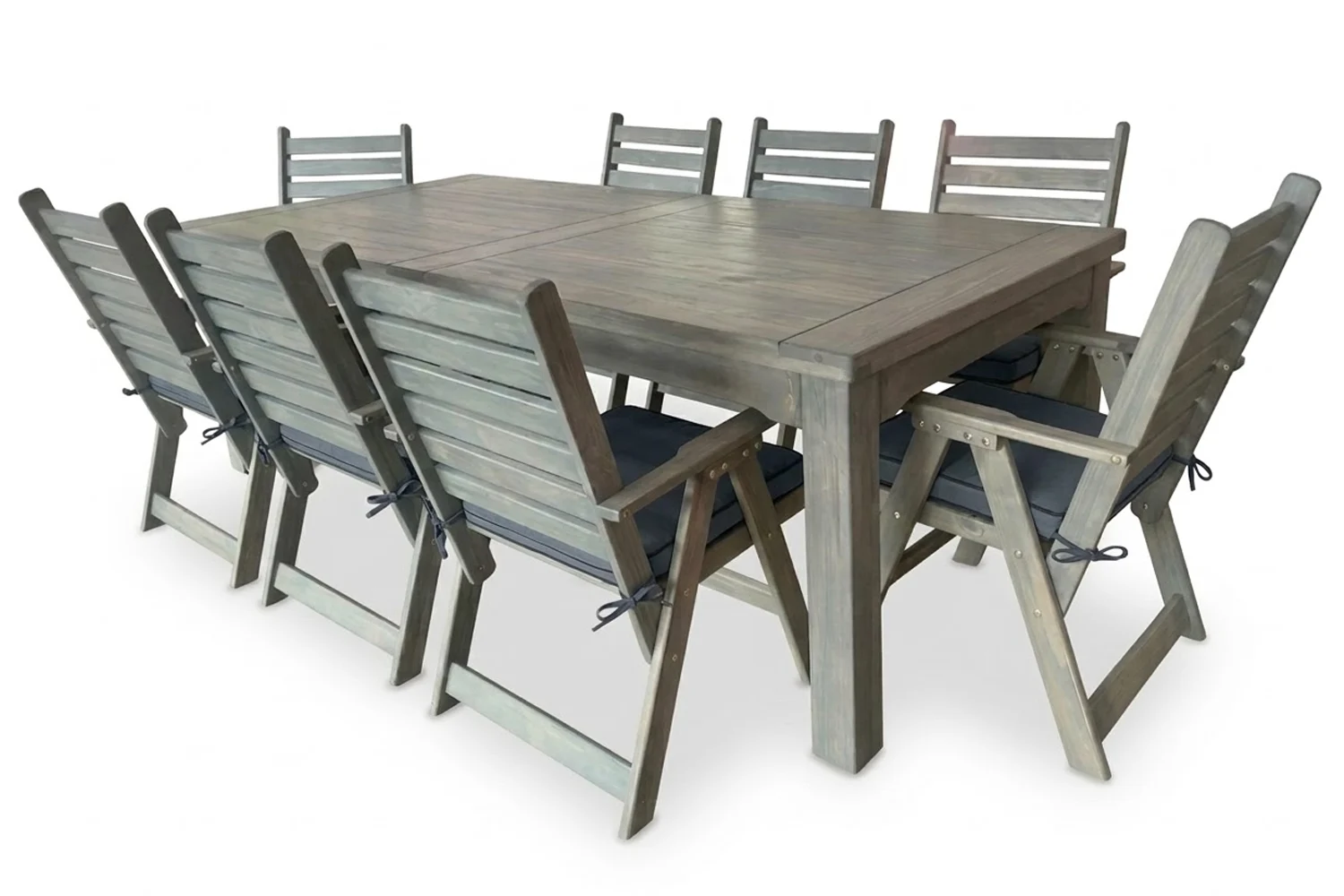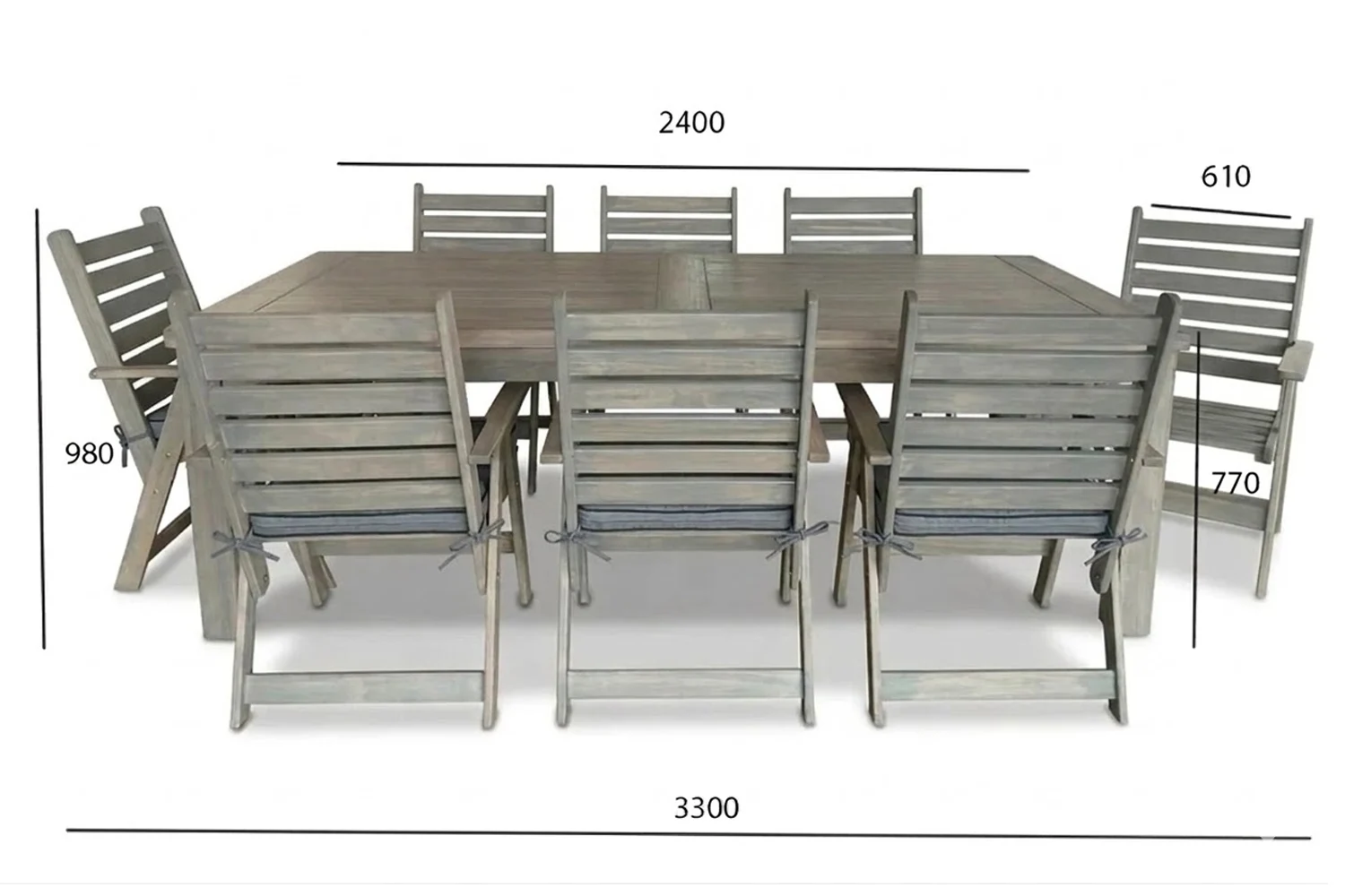 The Aged Oak Patio Dining Set 8-Seater 2400mm | x1 Table + x8 Highback Chairs + Charcoal Seat Cushions is characterized by its rustic charm and sturdy construction which makes it a must-have piece of quality furniture at a low price. Use under and cover with a cover bag if not under roof cover