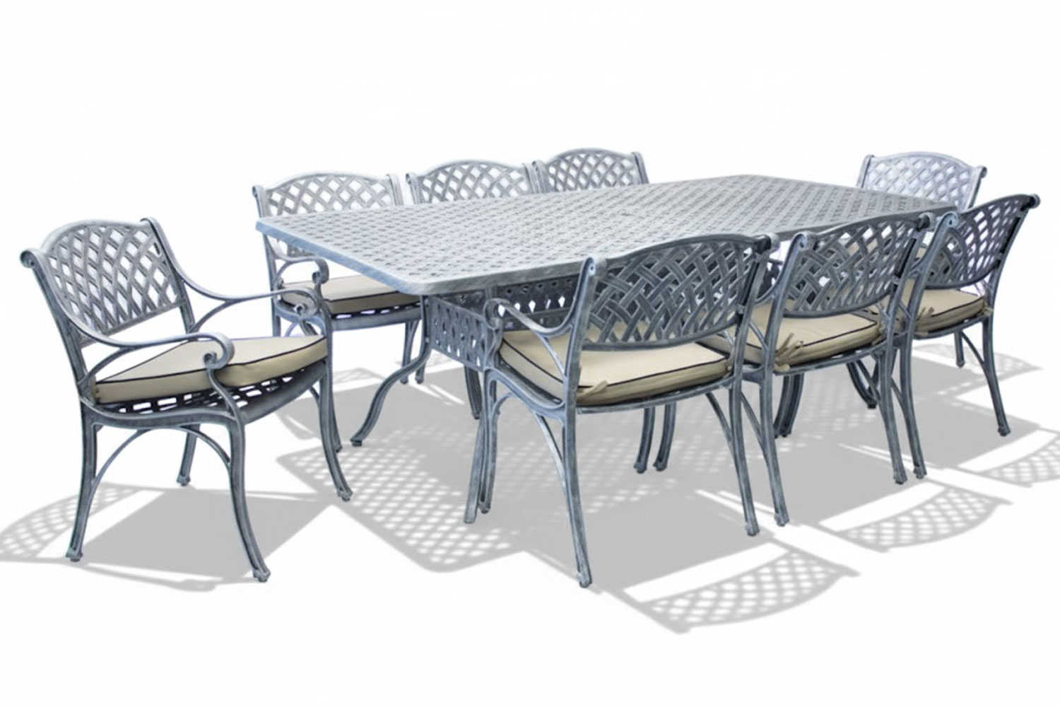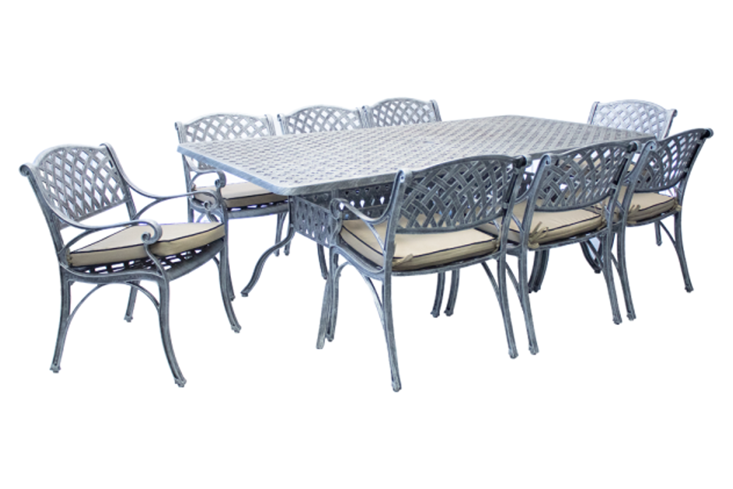 The Aluminium 8 Seater Dining Set with cushions can be left outside all year round. Cast aluminium is extremely comfortable, stylish and of course practical.