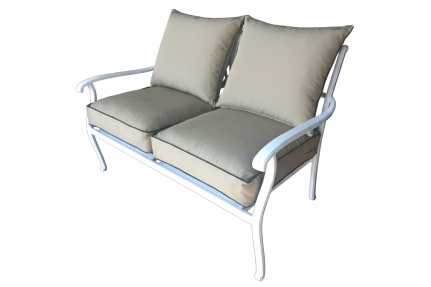 The Aluminium Morris 2 Seater with cushions can be left outside all year round. Cast aluminium is extremely comfortable, stylish and of course practical.