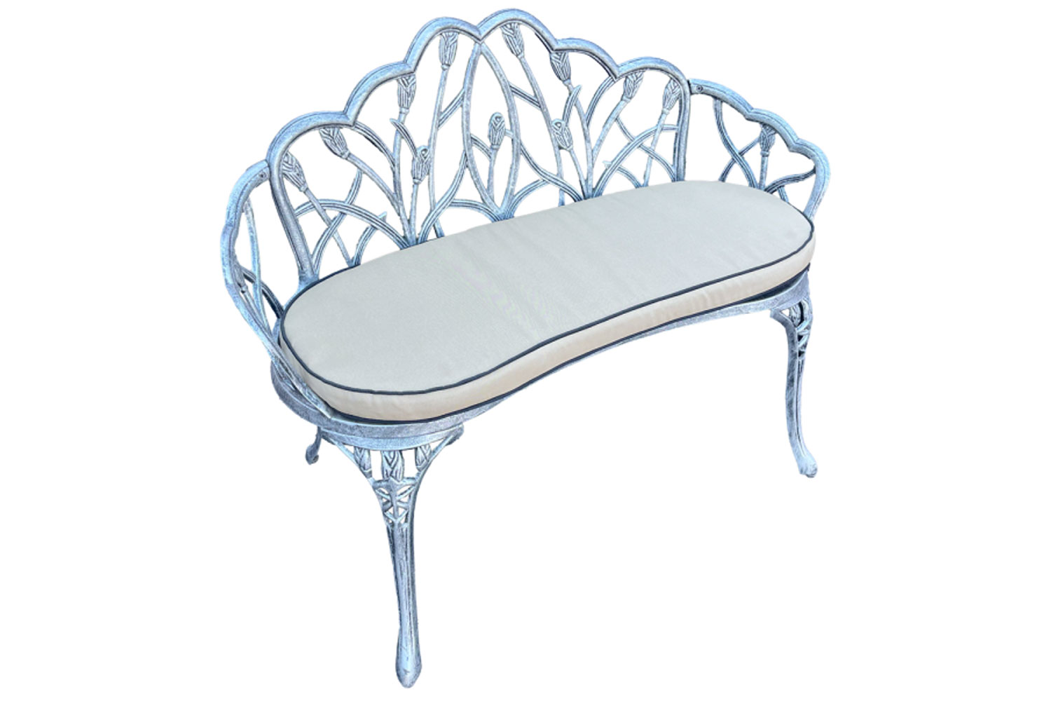 Introducing our Aluminium Tulip Park Bench Silver with Beige Cushion . Made of cast aluminium, these sets can be left outside all year round. Cast aluminium is extremely comfortable, stylish and of course practical.