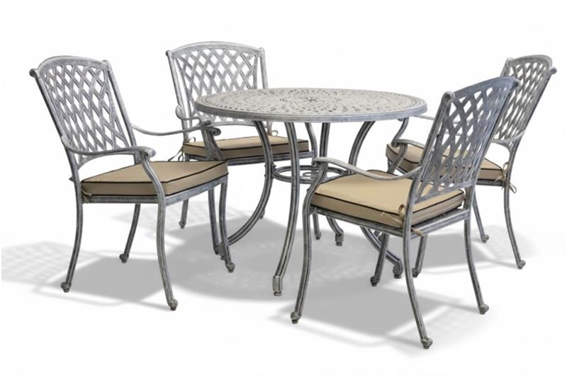 The Aluminium Tuscan 4 Seater Dining Set Special 1000mm round with cushions can be left outside all year round. Cast aluminium is extremely comfortable, stylish and of course practical.