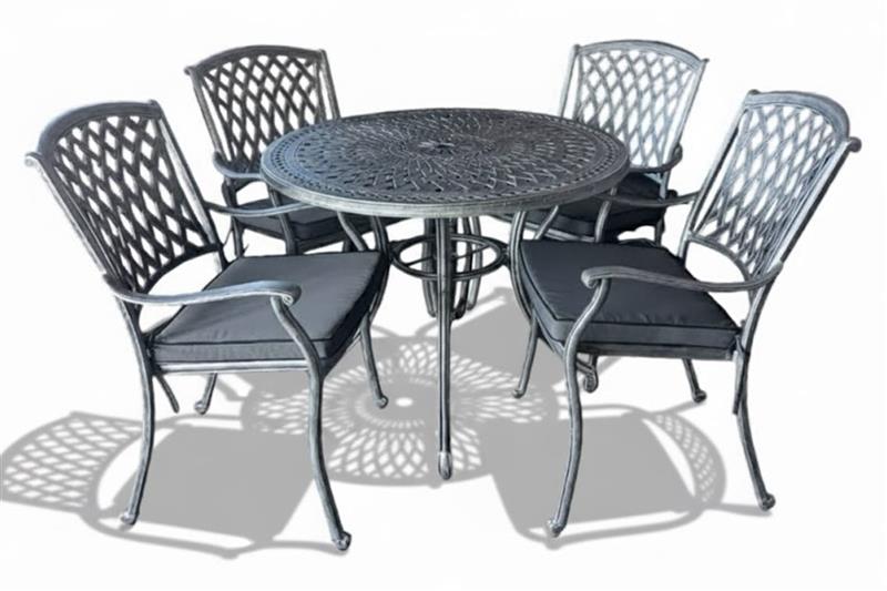 The Aluminium Tuscan 4 Seater Dining Set Special 1000mm round with cushions can be left outside all year round. Cast aluminium is extremely comfortable, stylish and of course practical.