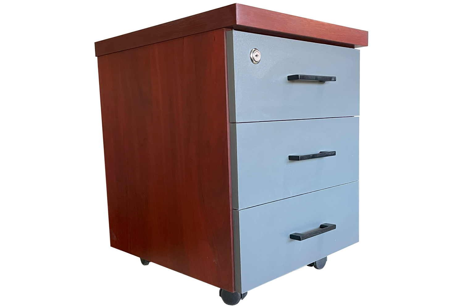 Strong, durable and easily maintained. Our IQ Mobile Pedestal 3 Drawers – Royal Mahogany and Grey is locally manufactured using only the highest quality Melamine.
