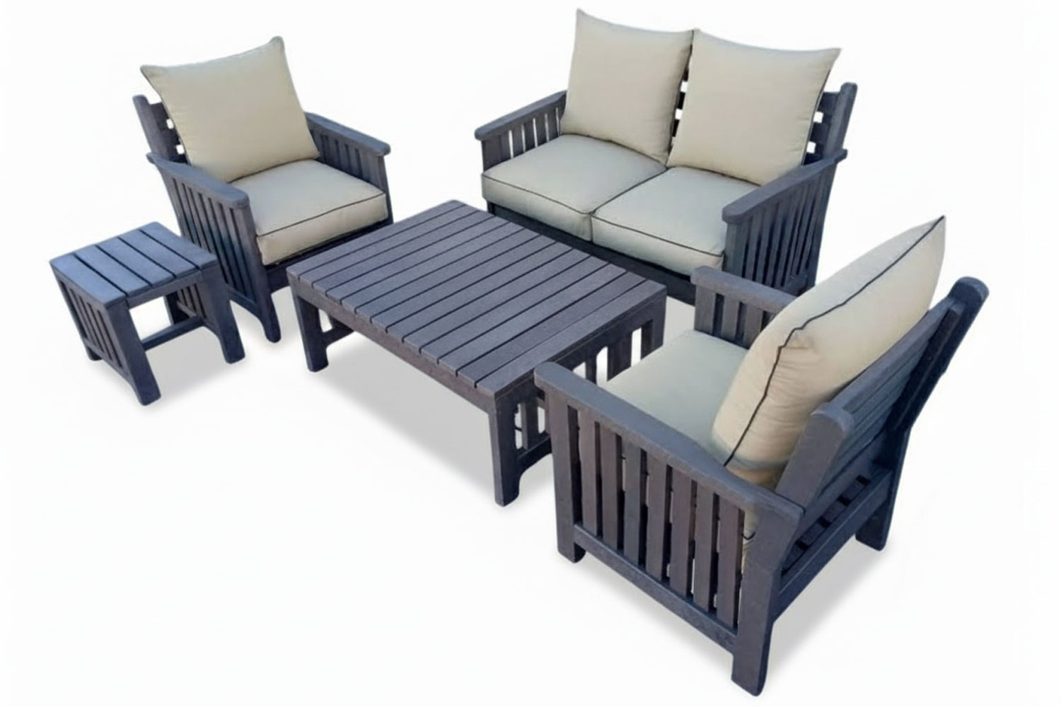 Royal Morris 4 Seater Set, 2x 1 Seater, 1x 2 Seater, Coffee Table and Side Table – Including Beige Cushions (RECYCLED PLASTIC)